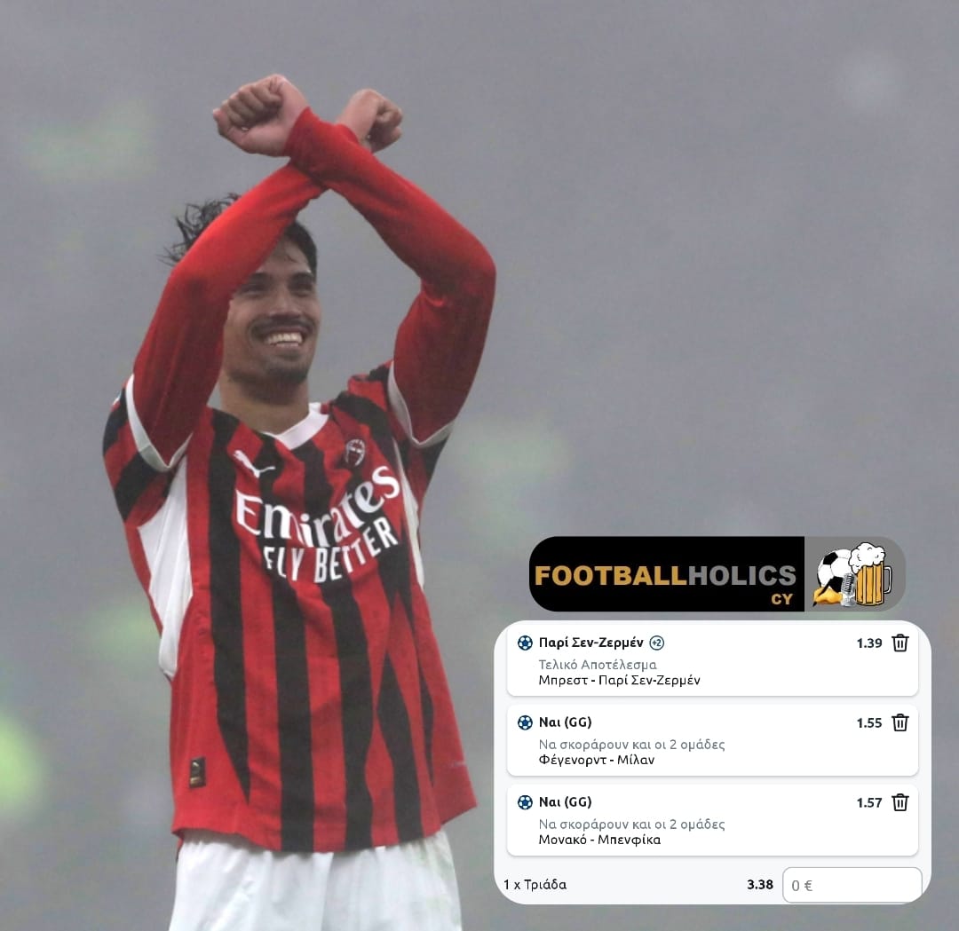 - Φέγενορντ και Μίλαν πέρα από την πρόσφατη μεταγραφή Χιμένεζ θα τεθούν αντιμέτωπες σε αυτή τη playoff φάση. Η Μίλαν έχει στρώσει αλλά δεν εμπνέει απόλυτη εμπιστοσύνη και είναι βέβαιο ότι οι Ολλανδοί θα την κάνουν να περάσει δύσκολα στο Ντε Κάιπ. Αμφίσκορο στο 1.55.